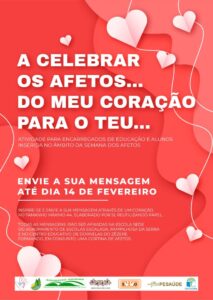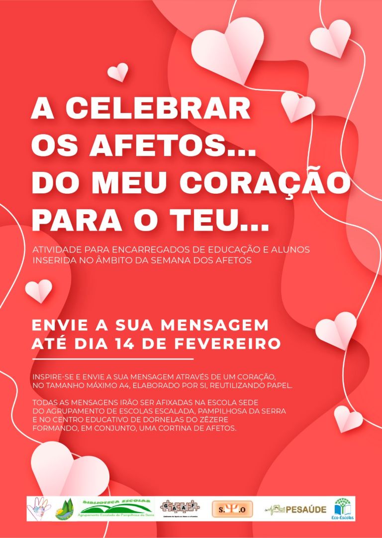 Em virtude da aproximação do dia 14 de fevereiro e de forma a comemorar esta data com significado emocional, vimos propor a colaboração de todos(as) os(as) Encarregados(as) de Educação e alunos(as) interessados(as) na criação de uma “cortina dos afetos”. Deste modo, solicitamos a vossa colaboração na elaboração de um coração em papel (jornal, revistas, papel de embrulho, cartolinas…) com uma mensagem de afeto. O coração pode ser entregue aos Diretores de Turma, no GAAF ou na Biblioteca até dia 14 de fevereiro.